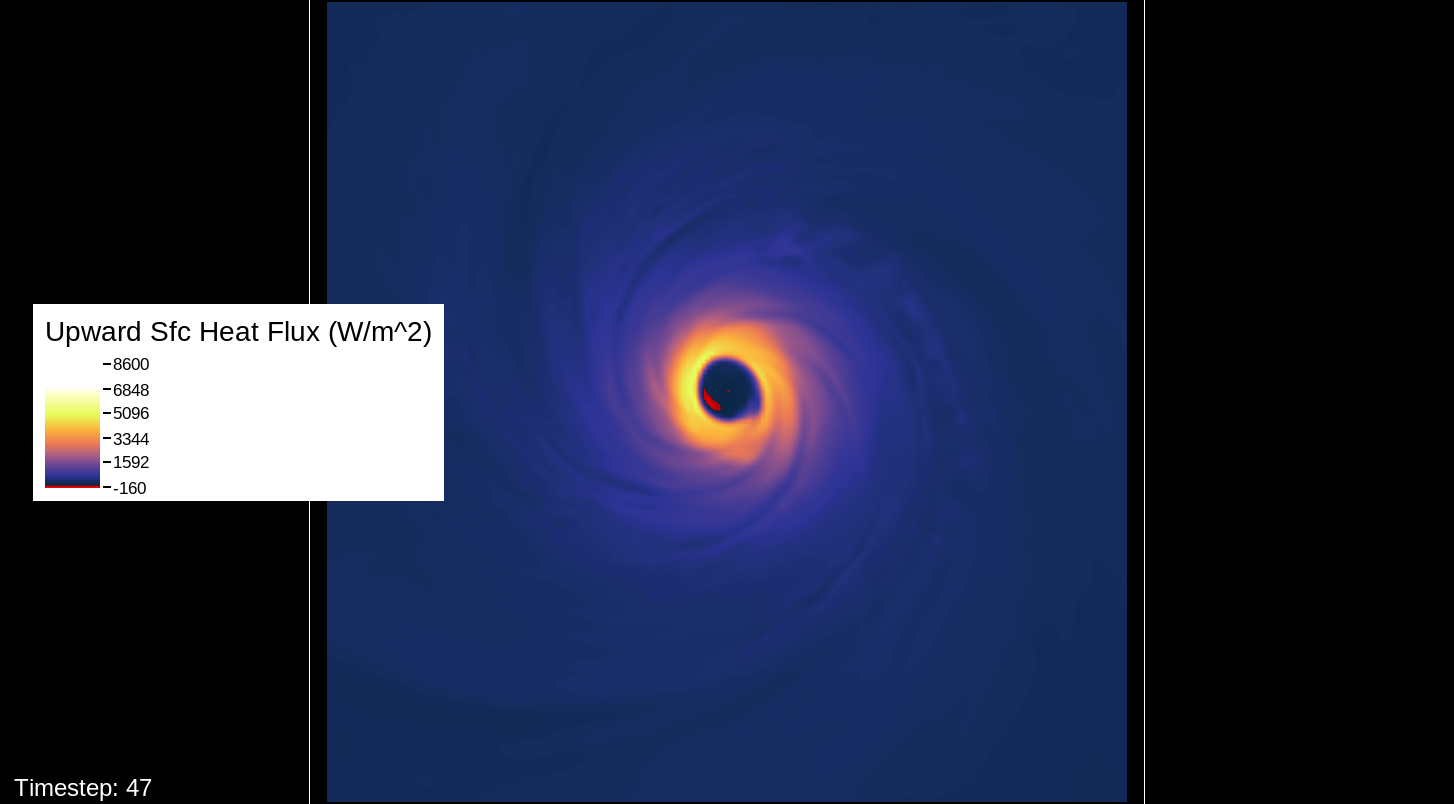 A note about the surface wind images, mostly for WRF experts and those who want to simulate the storm themselves: The images in this viewer do not represent the speed computation of the U10 and V10 speeds (the square root of the product of each of these added together). The reason for this is that the WRF’s surface wind computation is questionable for high-intensity storms. I’ve used an alternate computation that I think is more realistic for this type of system.