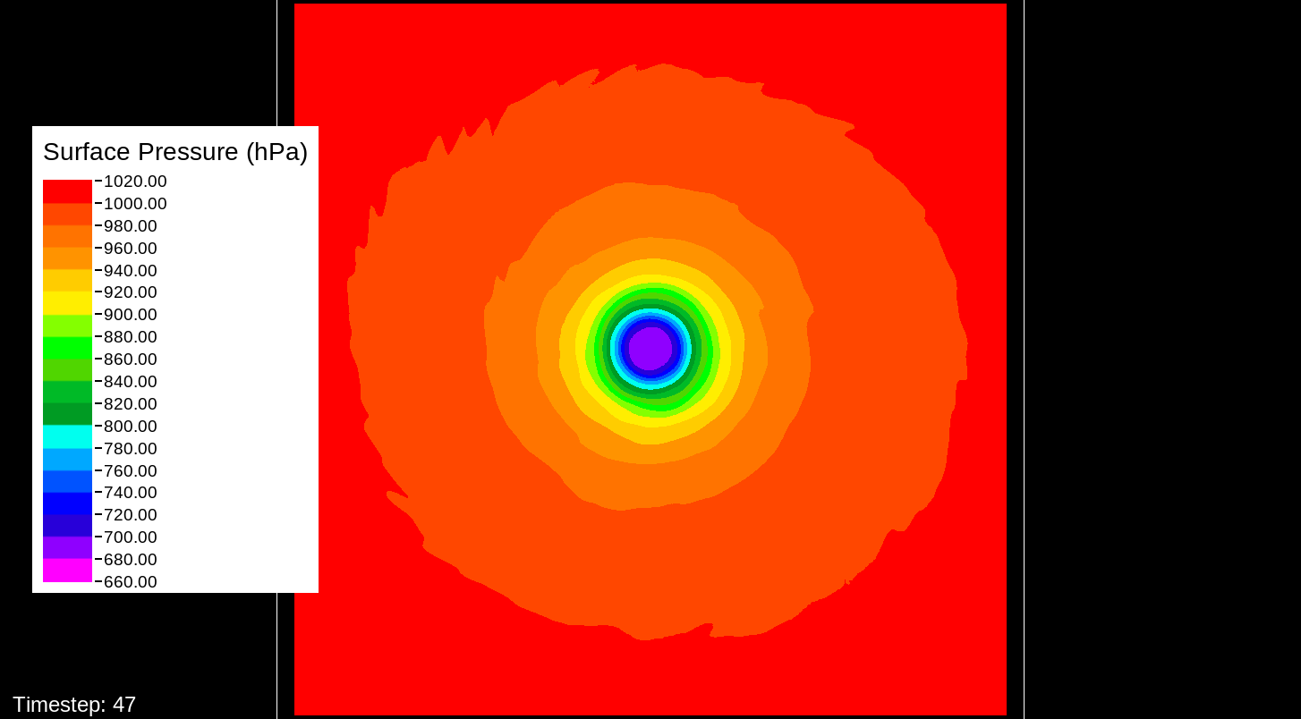 That it would be the PBL scheme makes sense, because this only happens for the U10 and V10 winds. For the U and V winds at all model levels, the winds are perfectly reasonable for increasingly deepening pressures, including in the sub-800 hPa range, and even into the theorized hypercane pressure range (sub-700 hPa). For these images, I have therefore used the level-0 (out of 30) U and V winds to calculate surface wind speeds.