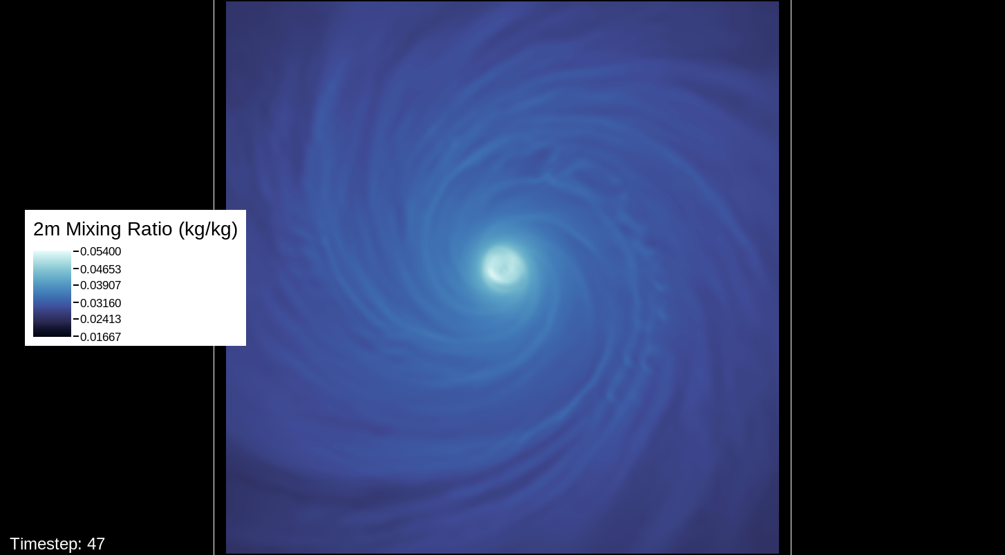 That it would be the PBL scheme makes sense, because this only happens for the U10 and V10 winds. For the U and V winds at all model levels, the winds are perfectly reasonable for increasingly deepening pressures, including in the sub-800 hPa range, and even into the theorized hypercane pressure range (sub-700 hPa). For these images, I have therefore used the level-0 (out of 30) U and V winds to calculate surface wind speeds.