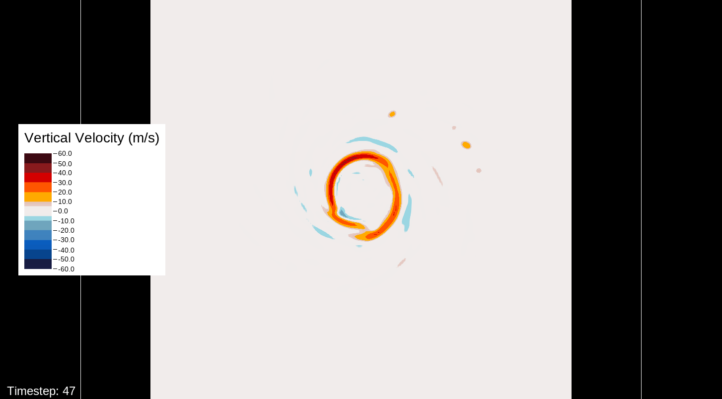 A note about the surface wind images, mostly for WRF experts and those who want to simulate the storm themselves: The images in this viewer do not represent the speed computation of the U10 and V10 speeds (the square root of the product of each of these added together). The reason for this is that the WRF’s surface wind computation is questionable for high-intensity storms. I’ve used an alternate computation that I think is more realistic for this type of system.