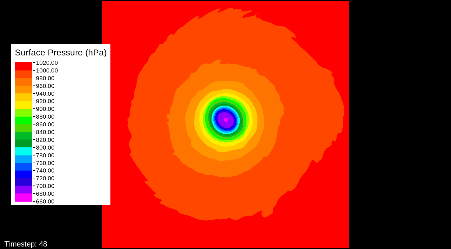 That it would be the PBL scheme makes sense, because this only happens for the U10 and V10 winds. For the U and V winds at all model levels, the winds are perfectly reasonable for increasingly deepening pressures, including in the sub-800 hPa range, and even into the theorized hypercane pressure range (sub-700 hPa). For these images, I have therefore used the level-0 (out of 30) U and V winds to calculate surface wind speeds.