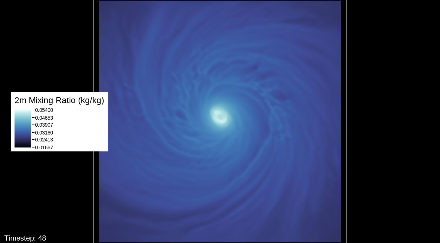 A note about the surface wind images, mostly for WRF experts and those who want to simulate the storm themselves: The images in this viewer do not represent the speed computation of the U10 and V10 speeds (the square root of the product of each of these added together). The reason for this is that the WRF’s surface wind computation is questionable for high-intensity storms. I’ve used an alternate computation that I think is more realistic for this type of system.
